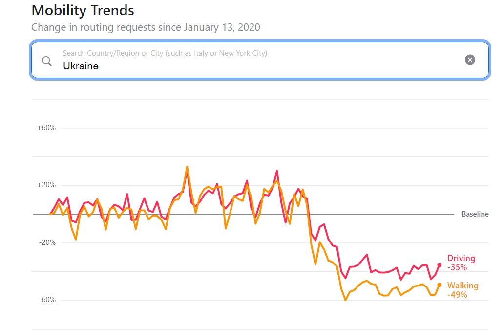 На сайті можна подивитися дані по різних країнах і регіонах. Так, згідно з даними компанії, після введення карантину українці почали на 49% рідше ходити пішки і на 35% менше їздити на машині.