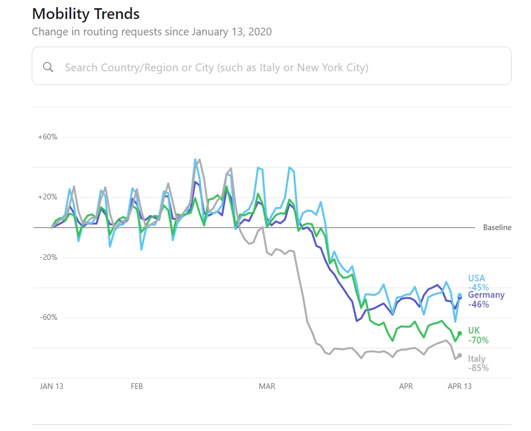 Компанія Apple відкрила доступ до анонімних даних про активність користувачів під час карантинних заходів, введених в різних країнах світу. Так, на сайті компанії можна подивитися динаміку того, наскільки часто користувачі ходили пішки і їздили на машині, з 13 січня 2020 року.