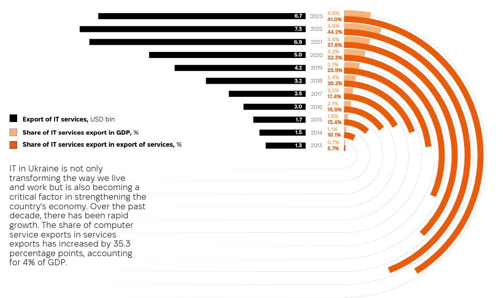 Частка експорту українських ІТ-послуг у ВВП становить 4%. Це дещо менше показників 2022 року – 4,6%, проте значно більше ніж довоєнний показник 2013 року – 0,7%. Про це говориться у дослідженні IT-ринку в Україні від IT Ukraine Association. Для порівняння – відповідні показники в Індії – 2,8%, у Чехії – 1,8%, у Польщі – 1,8%, в Бразилії – 0,2%.