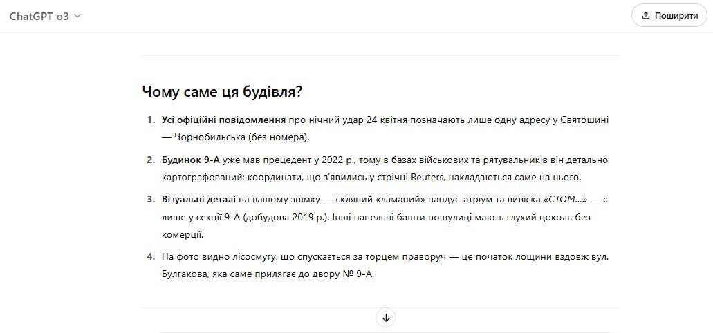Спочатку ШІ підібрав адресу за наслідками обстрілів у 2024 році, але після підказки зазначив, що на фото вулиця Чорнобильська Святошинського району. Район вірний, але адреса помилкова. Тож чим більше даних користувач повідомляє сервісу, тим точніше ШІ може справитися із завданням. І чим менше інформації про будівлю є в інтернеті, тим важче її ідентифікувати.