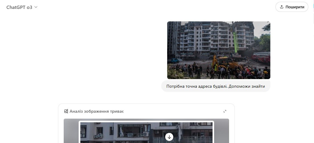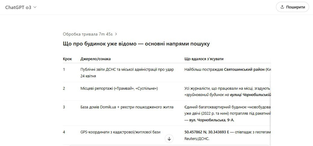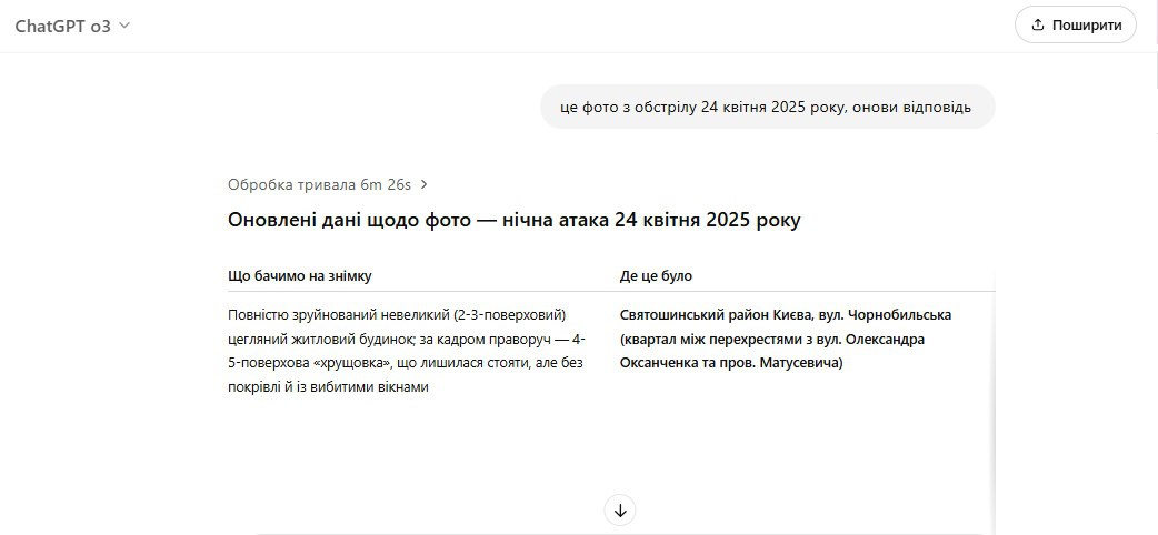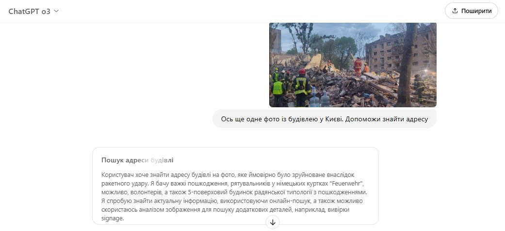 Тут на роздуми ChatGPT-o3 витратив майже 8 хвилин. Зрозумів, що це наслідки обстрілу, але підібрав найсвіжіші новини за 24 квітня 2025 року (черговий масований обстріл столиці) та вказав неправильну адресу.