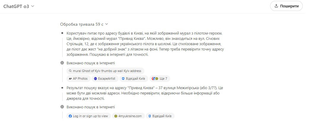 Із київським муралом «Привид Києва» за адресою Межигірська, 3 ШІ справився відмінно. Оскільки локація популярна, сам мурал є характерною ознакою будівлі і про це місце є багато інформації в інтернеті, ChatGPT-o3 легко визначив місце, витративши на роздуми менш як хвилини. На скріні можна побачити також, як ШІ розмірковує, аналізуючи фотографію.