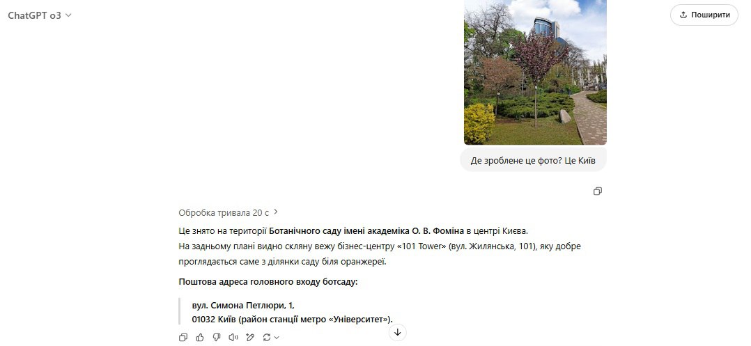 Ось приклади, як ChatGPT-o3 міркує та знаходить точні локації. Аналізуючи світлини з типовими для Києві наслідками ракетного влучання, ChatGPT-o3 не зміг вказати точну геолокацію на карті, але запропонував звузити пошук до Оболонського, Дарницького та Солом’янського районів.