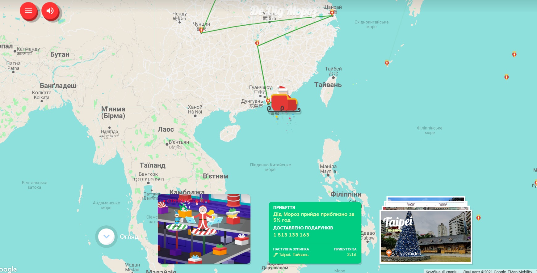 За даними Google (вкладка називається "Де Дід Мороз"), Санта знаходиться над територією Південно-Східної Азії, а в Україну прибуде лише за 5,5 годин. Він уже встиг доставити 1,5 мільйона подарунків.