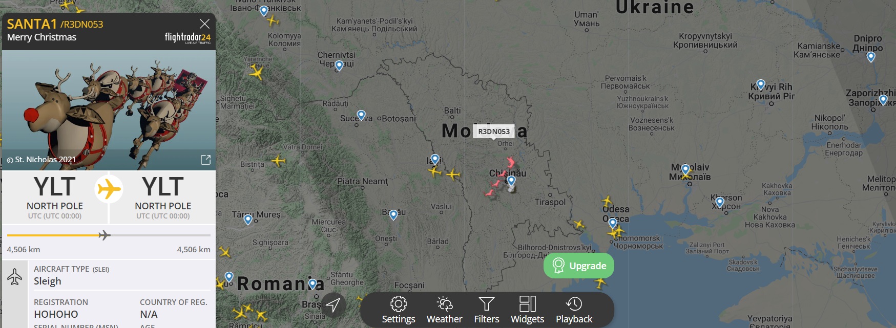 При цьому Flightradar навіть привласнив санкам доброго чарівника номерний знак - НОНОНО. За даними сайту, на момент публікації Санта вже пролетів на територію України і рухався у бік Молдови.