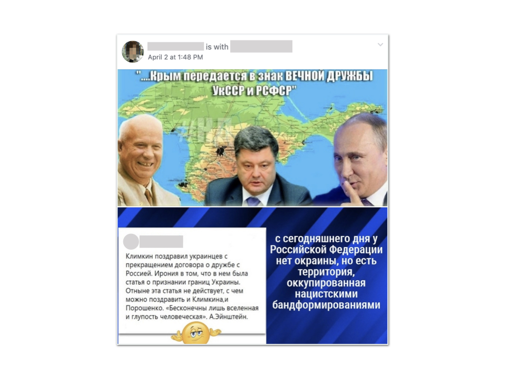 Зокрема частина видалених сторінок, дописи яких стосувались України, були пов'язані із діяльністю видалених акаунтів напередодні виборів президента України.