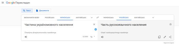 Сервіс Google Translate словосполучення «частина україномовного населення» перекладає російською мовою як «часть русскоязычного населения». На помилку звернули увагу користувачі соцмереж.