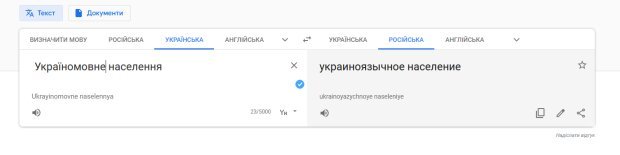 При цьому словосполучення «україномовне населення» Google переводить коректно як «украиноязычное население».