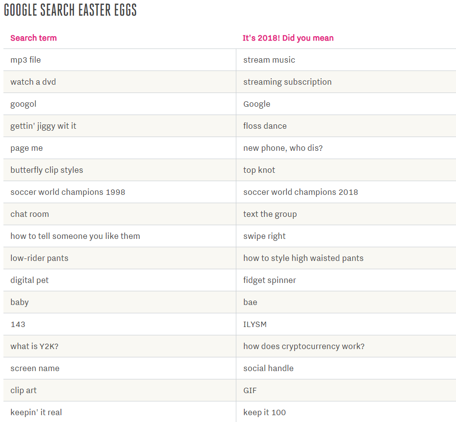Google також розсекретила деякі секретні "Великодні яйця" з історії веб-пошуку. Компанія представила старі запити та їх еквіваленти у нинішній час, наприклад: "цифровий вихованець" у 2018 році - "спінер", а питання "що таке проблема 2000 року?" рівносильне "як працює криптовалюта?" тощо. На окремій сторінці, компанія за категоріями розбила статистику найпопулярніших інтернет-запитів із 1999-го по поточний рік.