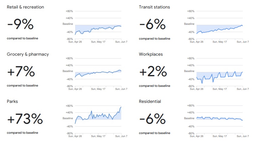 Дані розбиті на шість категорій: парки, торгівля і розваги, магазини і аптеки, станції транспорту, робочі місця і житло. Динаміка відображається по відношенню до "базової лінії" - показником переміщень з 3 січня до 6 лютого. Таким чином можна побачити, як змінилися пересування людей за час карантину в порівнянні з періодом до карантину. Свіжі звіти наводять дані з 26 квітня до 7 червня. Примітно, що в Україні різко зросло відвідування парків - на 73%. Інші зміни не перевищують 10%.