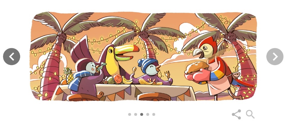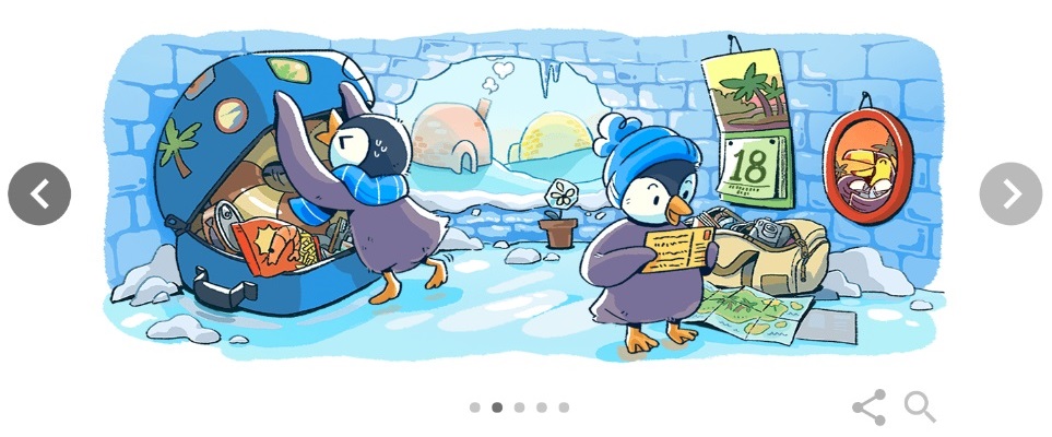 Головні герої дудла, пінгвіни, приїхали в гості до своїх родичів з жарких країн і разом з ними зустрічають Новий рік.