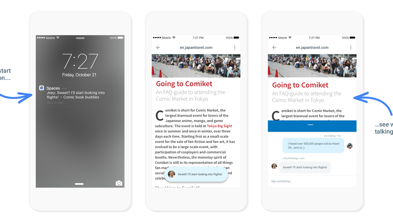 В офіційному блозі Google пропонує Spaces в якості інструменту для обговорення майбутніх заходів та інших тем. "Групові чати часто виходять за рамки теми, а інформація втрачається в нескінченних листуванні, і її стає складно знайти", - кажуть представники компанії.