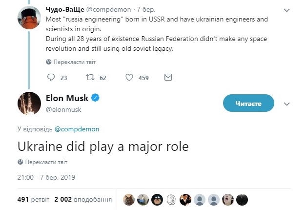 На що один з користувачів відреагував тим, що "більша частина російського ракетобудування народилася в СРСР і над нею працювали українські інженери і вчені". Він також додав, що "за останні 28 років Росія не здійснила жодної космічної революції і досі використовує стару радянську спадщину". На це Маск відповів: "Україна дійсно зіграла головну роль".