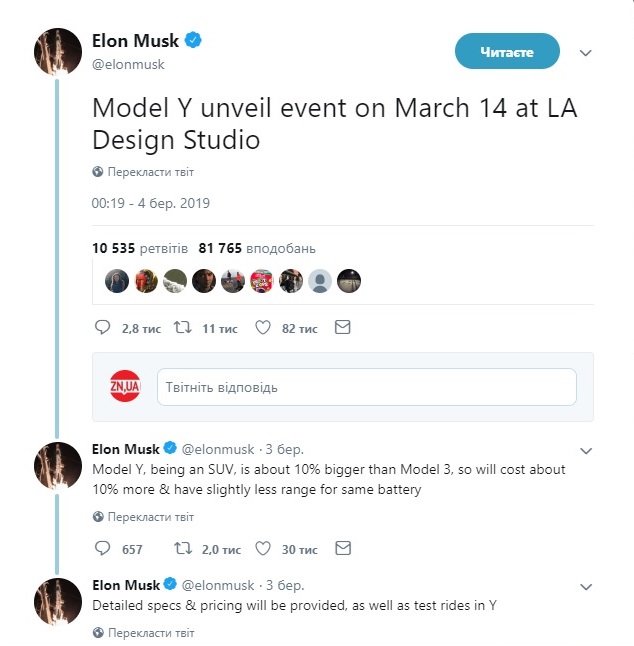 Засновник компанії Tesla Ілон Маск на своїй сторінці в Twitter назвав дату презентації нового електрокара компанії Model Y. Нову машину представлять вже 14 березня на спеціальному заході Design Studio в Лос-Анджелесі.