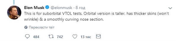 У коментарях до посту Маск також написав: "це зразок для суборбітальних тестів. Орбітальна версія вища, оснащена більш товстою обшивкою (без складок) і плавно вигнутим носовим відділом".