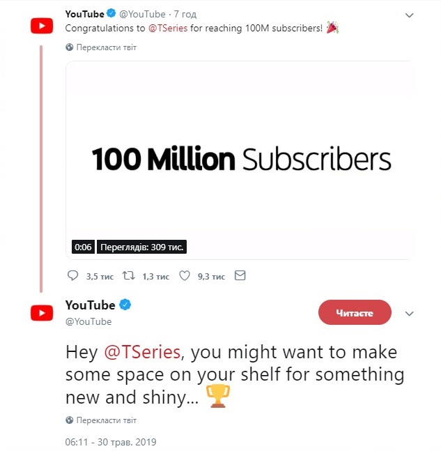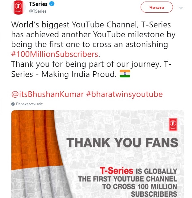 YouTube-канал індійської компанії T-Series, яка займається випуском фільмів і музики, став першим в історії, якому вдалося зібрати 100 мільйонів передплатників. Про це компанія повідомила на своїй сторінці в Twitter.
