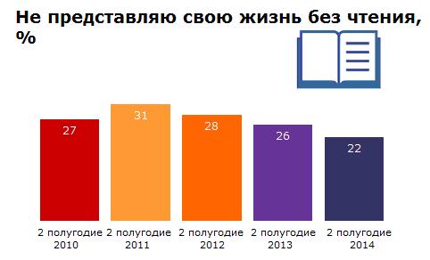 "Відсоток українців, які читають друковані книги, незначно впав з 64,5% в 2011 році до 62% в 2014. При цьому більш ніж в два рази зросла частка людей, які читають електронні книги – з 6,5% у 2011 до 13,7% у 2014 році", - йдеться в повідомленні компанії за результатами опитування, в якому взяли участь 10 тис. чоловік у віці від 12 до 65 років.