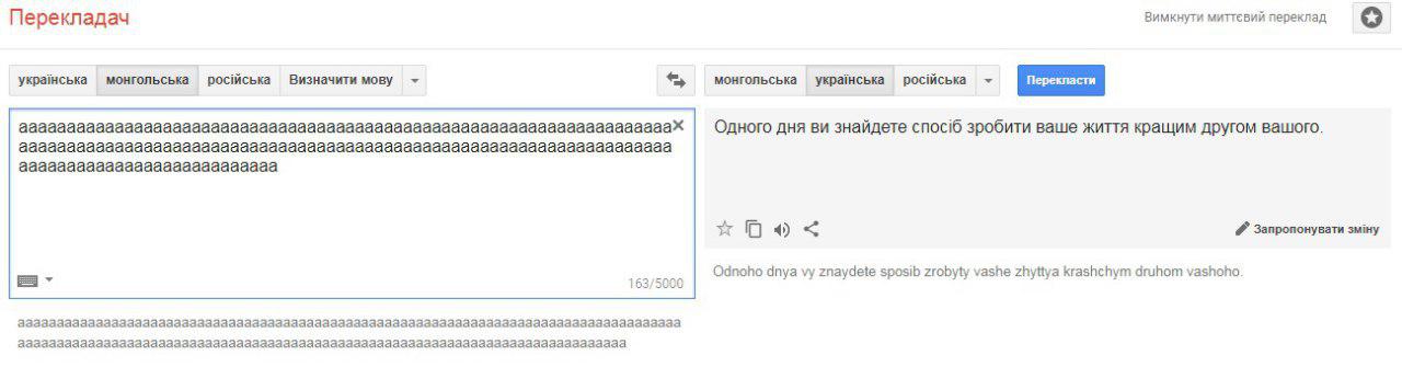 Користувачі мережі звернули увагу на те, що якщо вибрати Google Translate переклад з монгольської мови на українську і ввести в нього багато повторюваних літер, він почне видавати дивний результат.