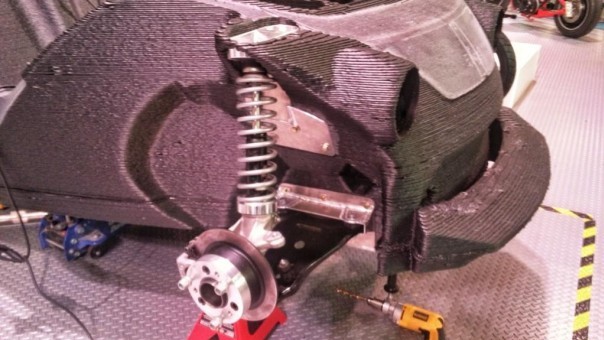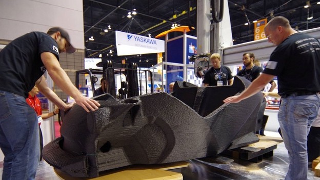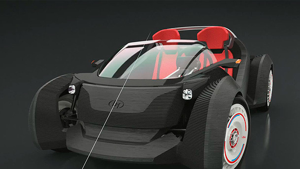 Процес друку першого автомобіля роздрукованого на 3D-принтері стартував прямо в одному з виставкових залів International Manufacturing Technology Show, а в якості основного матеріалу був використаний пластик в комбінації з углеволокном. Автомобіль можна буде вважати майже суцільно виготовлену на 3D-принтері, так як електродвигун, акумуляторні батареї, елементи підвіски, проводка та інші складові конструкції автомобіля поставляються окремо і без залучення при їх виробництві технології тривимірної друку.