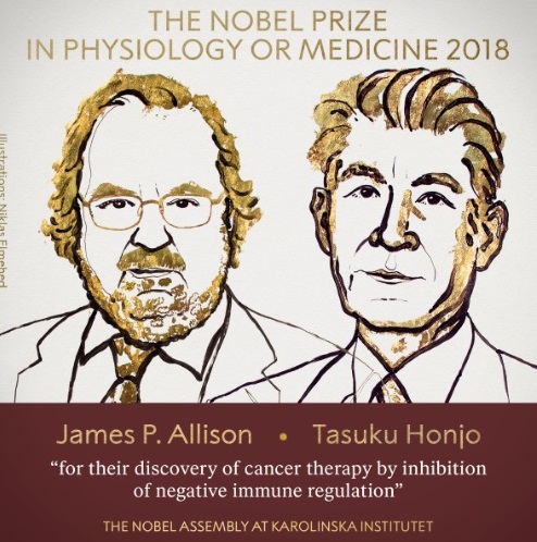 Нобелівська премія з фізіології і медицини присуджена Джеймсу П. Еллісону і Тасуко Хондзе "за відкриття терапії раку шляхом інгібування негативною імунної реакції".