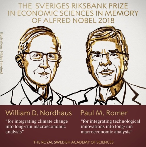 Премія з економіки пам'яті Альфреда Нобеля присуджена двом ученим. Першу половину премії отримає Вільям Нордхаус "за інтеграцію змін клімату в довгостроковий макроекономічний аналіз". Друга частина премії присуджено Полу Ромеро "за інтеграцію технологічних інновацій в довгостроковий макроекономічний аналіз".