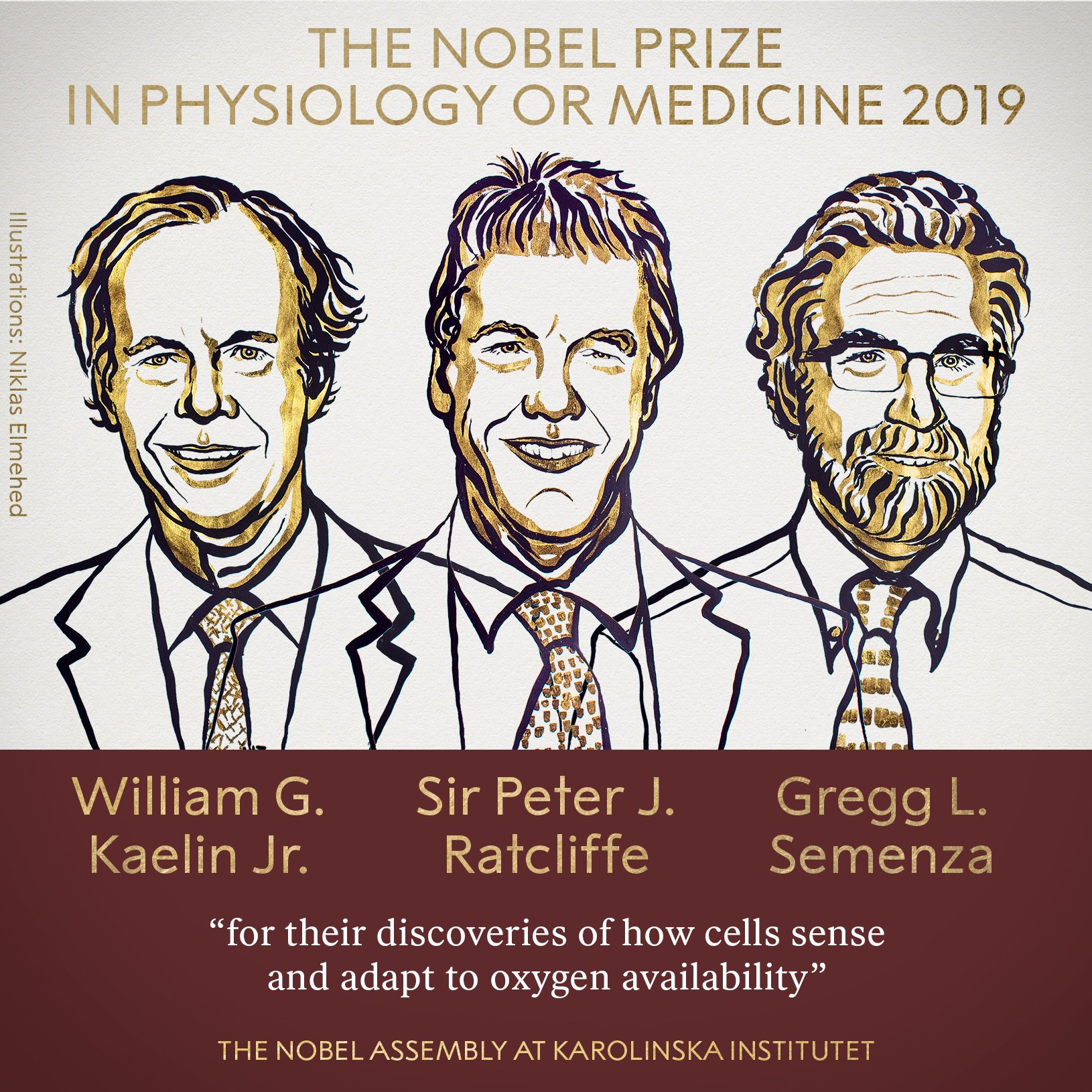 У цьому році Нобелівську премію присудили Вільяму Каеліну, Пітеру Реткліффу та Греггу Семенза з формулюванням "за відкриття того, як клітини відчувають і адаптуються до нестачі кисню". Дослідникам вдалося визначити молекулярний механізм, який регулює активність генів у відповідь на різні рівні кисню.