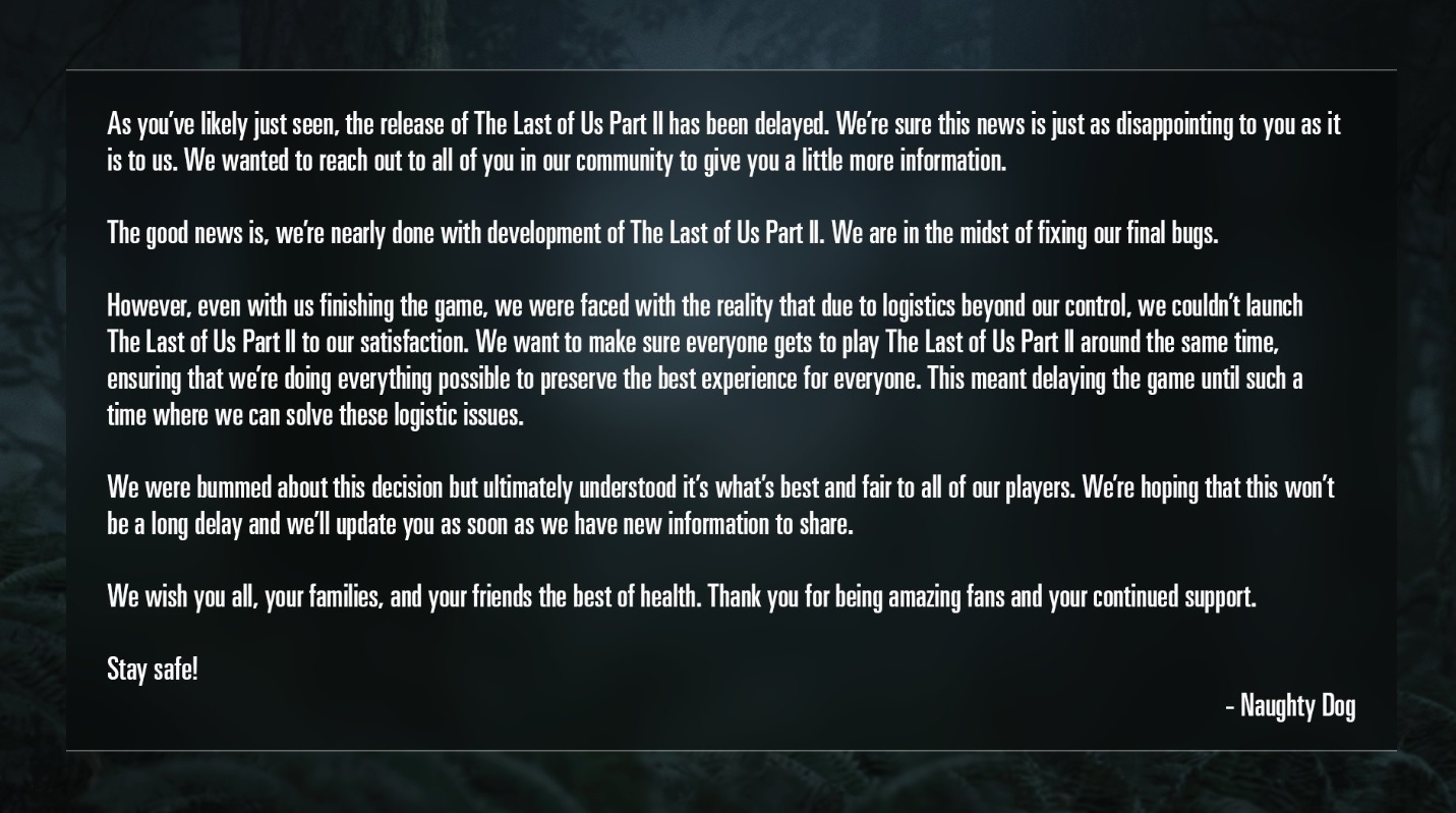 Розробники сиквела гри The Last of Us знову перенесли його реліз. Як повідомляється на сторінці компанії Naughty Dog в Twitter, це пов'язано з ситуацією, яка склалася в світі з поширення коронавірусу.
