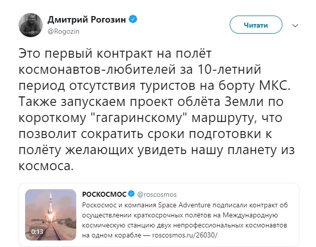 Крім того, "Роскомос" заявив про те, що підписав з компанією Space Adventure контракт на короткострокову доставку на борт Міжнародної космічної станції туристів. Два "непрофесійних космонавта" будуть доставлені на борт МКС у 2021 році.