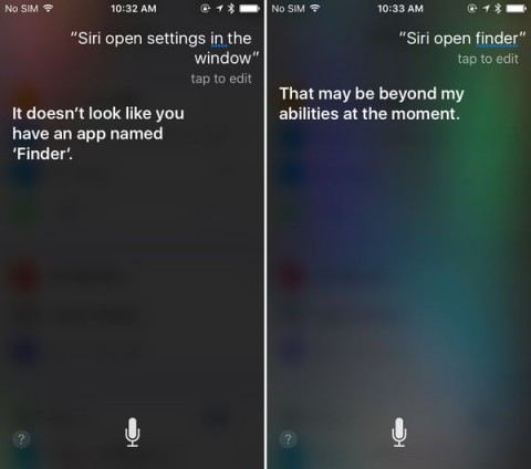 Якщо попросити відкрити налаштування у вікні, то Siri відповість, що на пристрої не встановлено додаток Finder. А якщо попросити запустити Finder, то Siri скаже, що на даний момент це не в її силах.