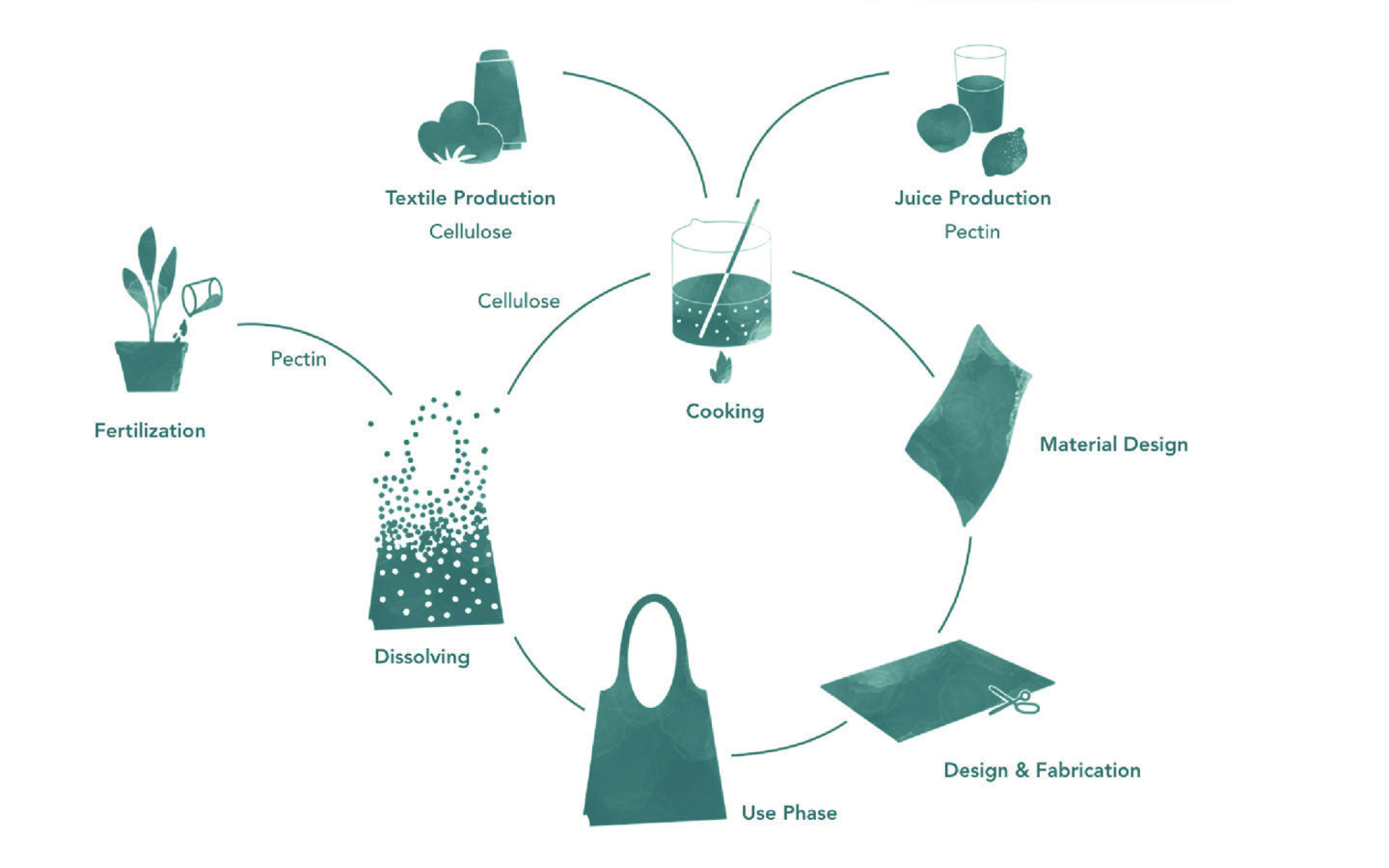 Берлінські студенти-дизайнери Лобке Бекфельд і Йоханна Хехемейер-Кюртен розробили напівпрозорий мішок з фруктовою шкірки, який розчиняється у воді і може використовуватися для добрива рослин, коли в ньому більше немає необхідності.