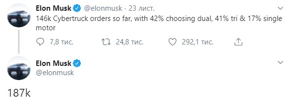 Ілон Маск на своїй сторінці в Twitter заявив про те, що компанія Tesla отримала вже 187 тисяч попередніх замовлень на свій броньований пікап Cybertruck. Його виробництво стартує в 2021 році, а попередньо замовити машину можна з депозитом в 100 доларів.