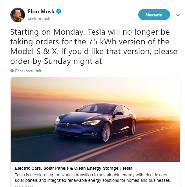 Компанія Tesla припинить продажі модифікацій електрокарів Model S і Model X з акумулятором на 75 кВт/год з 14 січня. Про це на своїй сторінці в Twitter заявив засновник компанії Ілон Маск.