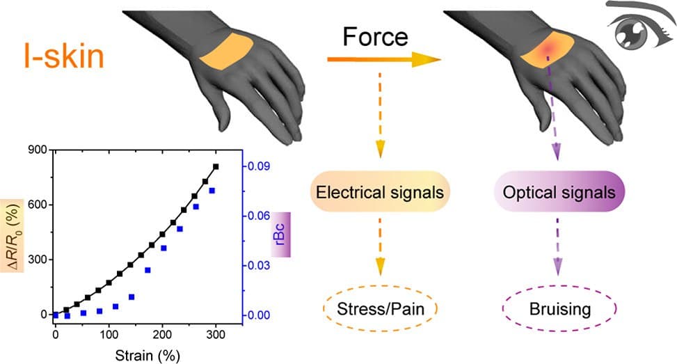 Вчені з Китайського університету Гонконгу створили шкіру, яка темніє після удару, отримуючи "синці", схожі на людські, повідомляє журнал ACS Applied Materials & Interfaces.