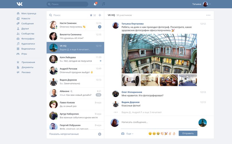Зміни в дизайні торкнулися розділів "Новини", "Повідомлення", "Сповіщення", "Фотографії" і розділів, що розповідають про компанію. Зокрема, тепер в розділі "Повідомлення" користувачу буде показаний список останніх бесід і поточний відкритий чат.