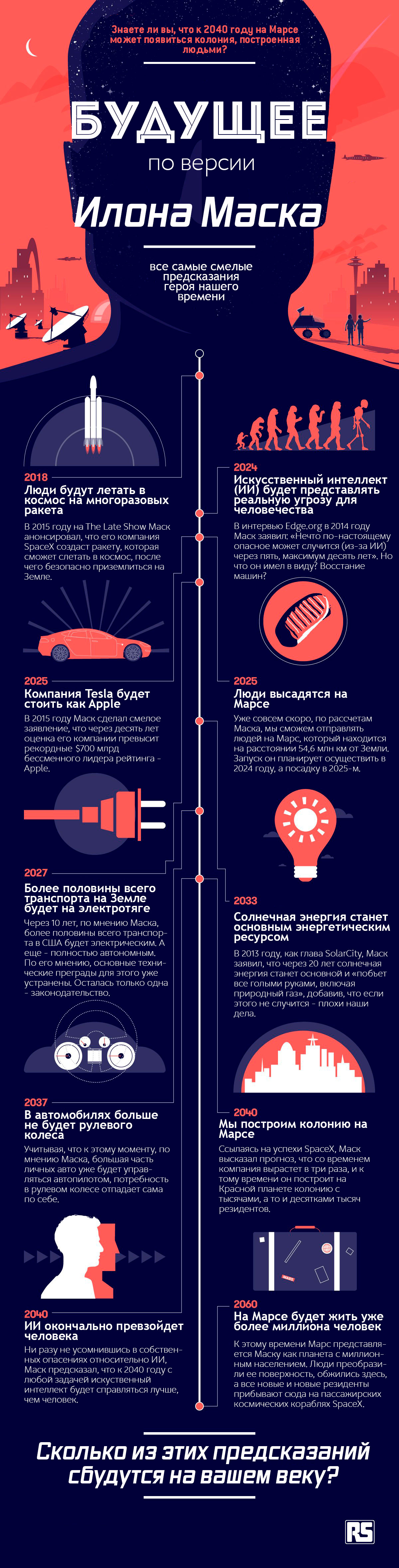 AIN.UA запропонував російськомовну версію інфографіки, яка була складена RS Components та ілюструє погляди Маска на майбутнє до 2060 року.