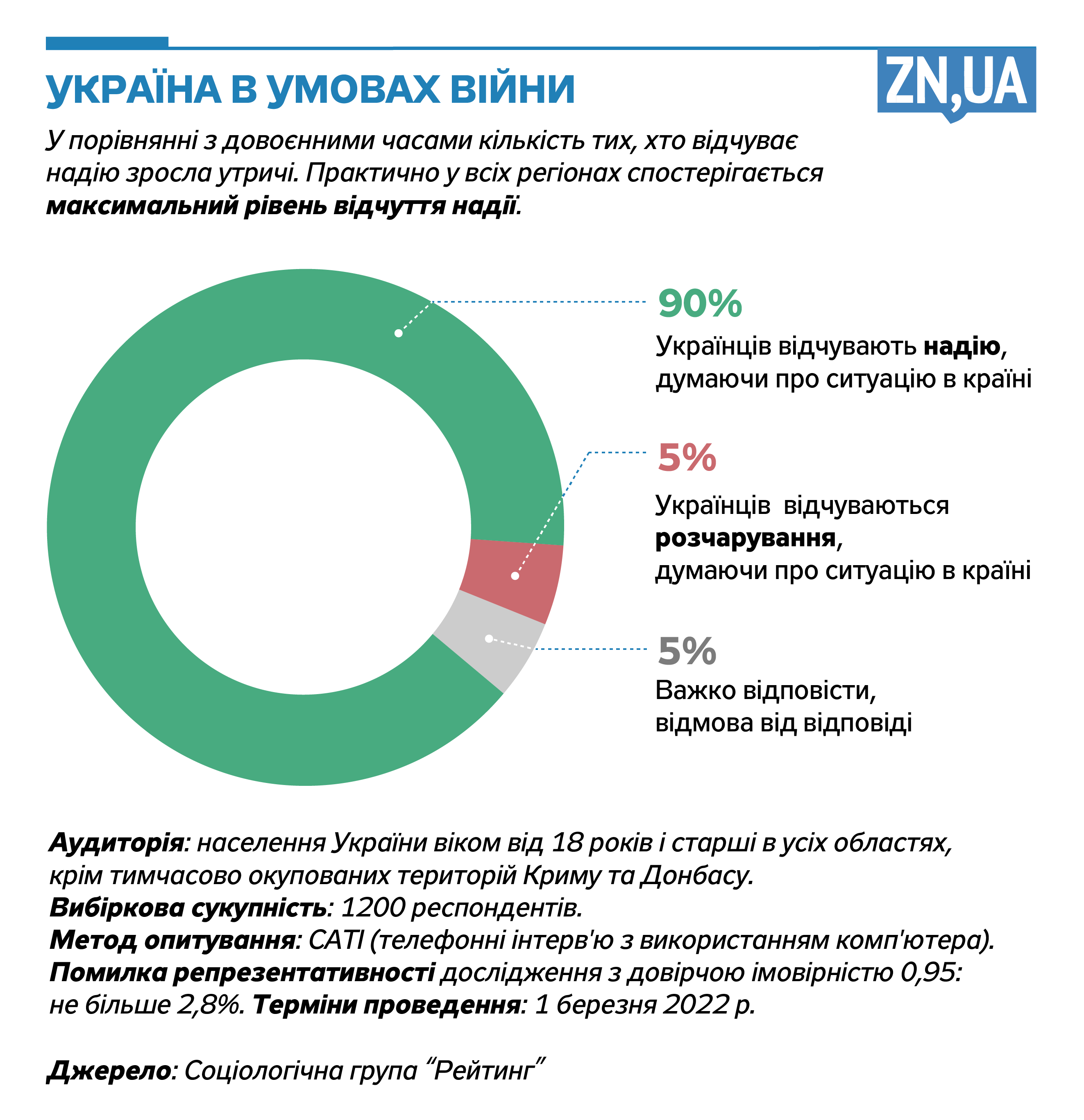 У порівнянні з довоєнними часами кількість тих українців, хто відчуває надію зросла утричі. Практично у всіх регіонах спостерігається максимальний рівень відчуття надії. 90% опитаних, думаючи про ситуацію в країні, відчувають надію. Лише 5% відчувають розчарування. Про це свідчать результати опитування, проведеного Соціологічною групою «Рейтинг».