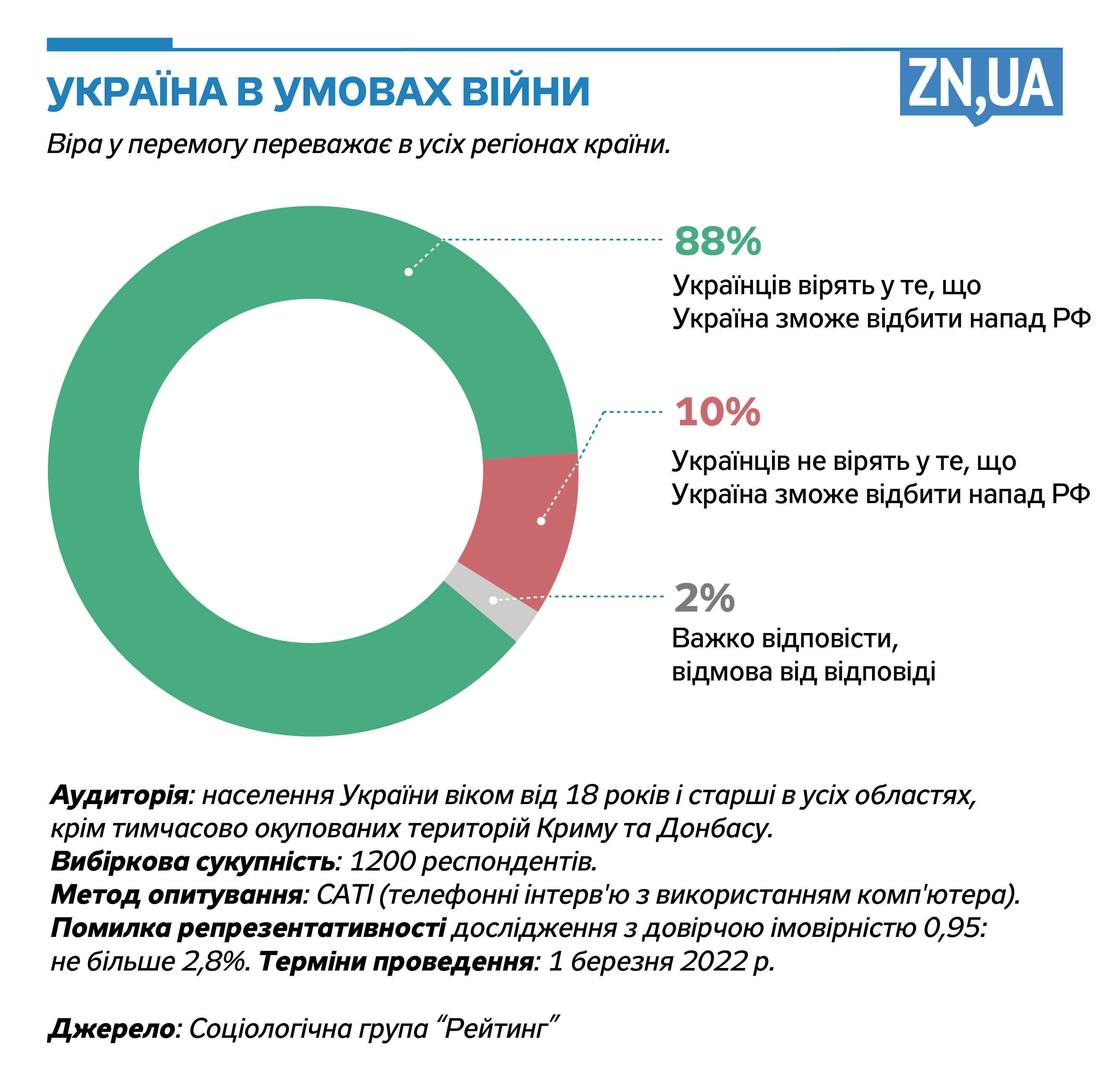 - 88% опитаних вірять у те, що Україна зможе відбити напад Росії. Практично щодня цей показник зростає. Лише 10% сьогодні не мають такої впевненості. Віра у перемогу переважає в усіх регіонах країни;