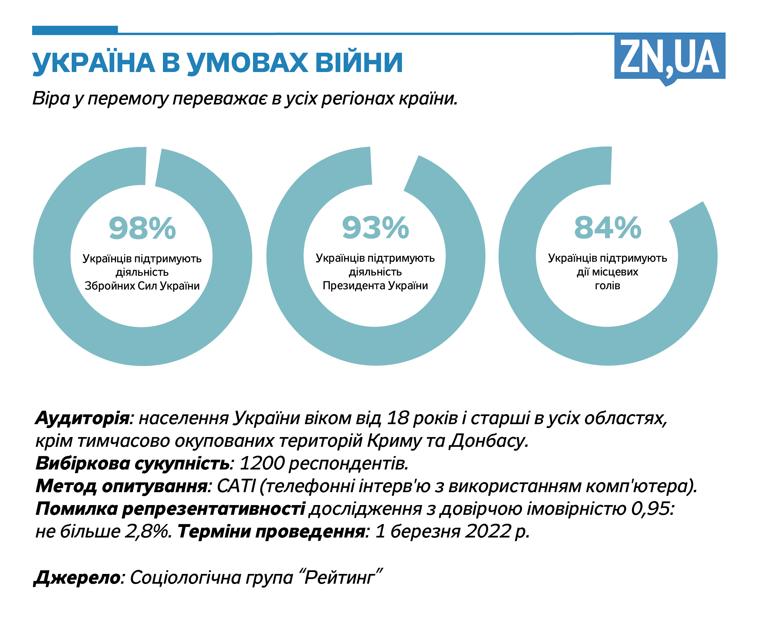 - 98% опитаних підтримують діяльність Збройних Сил України, 93% підтримують діяльність Президента, 84% підтримують дії місцевих голів;