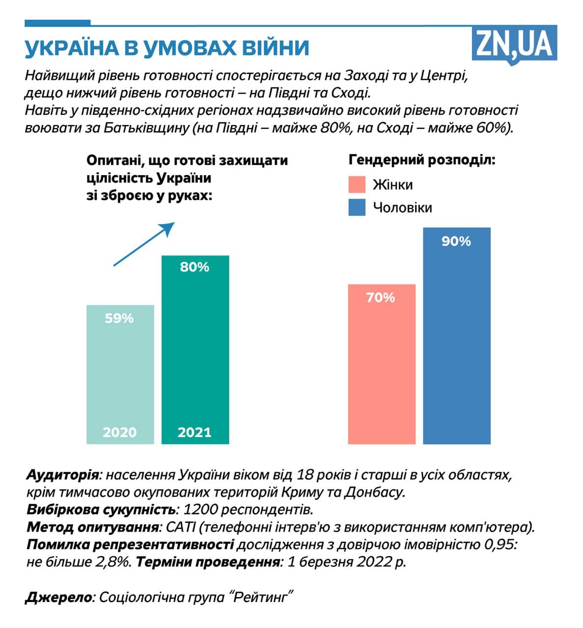 - 80% опитаних зазначили, що готові захищати цілісність України зі зброєю у руках. У порівнянні із довоєнними часами цей показник значно зріс (у 2020 році – 59%). Найвищий рівень готовності спостерігається на Заході та у Центрі, дещо нижчий рівень готовності – на Півдні та Сході. Але навіть у південно-східних регіонах надзвичайно високий рівень готовності воювати за Батьківщину (на Півдні – майже 80%, на Сході – майже 60%). У гендерному розрізі готовність воювати зі зброєю за Україну висловили 90% чоловіків та 70% жінок.