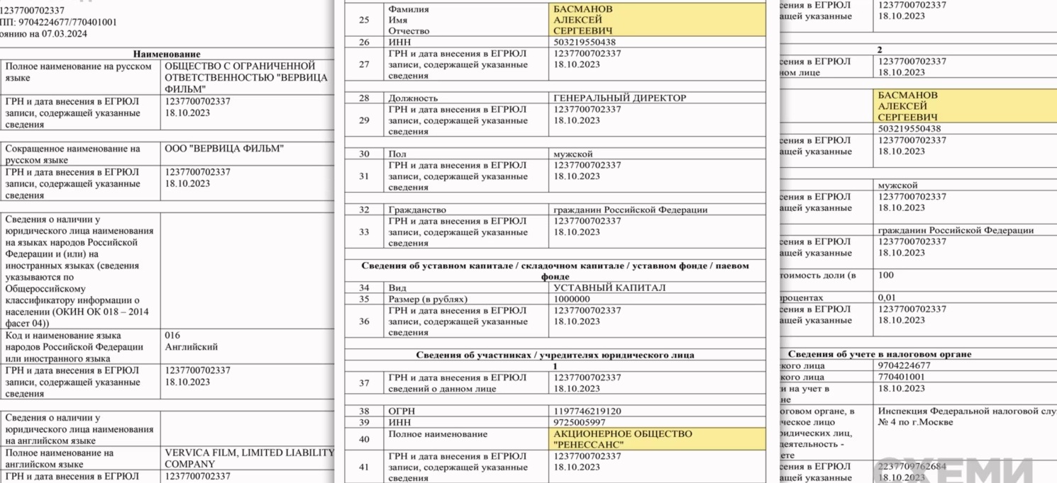Згідно з реєстру юридичних осіб РФ, засновники компанії «Вервица Фильм» - російське АО "Ренессанс" (99,99%), 0,01% належить Басманову Олексію Сергійовичу. Згідно з декларацією Віктора Медведчука, бенефіціарною власницею АО "Ренессанс" є його дружина Оксана Марченко.