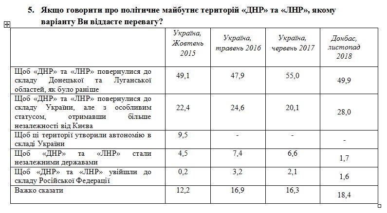 Загалом близько половини громадян як в цілому в Україні, так і на українському Донбасі віддають перевагу поверненню окупованих територій в склад України на довоєнних умовах, ще близько 20% громадян України і 28% мешканців Донбасу бачать їх у складі України, але більш самостійними від центрального уряду.
