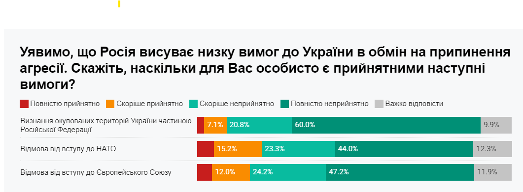 При цьому всьому більшість українців говорять про неготовність виконувати вимоги Росії задля завершення війни. На визнання окупованих територій частиною РФ навіть заради припинення війни готові піти лише 9% українців, хоча торік таких було ще менше – 5%, а неприйнятним таку вимогу вважає 81% опитаних.