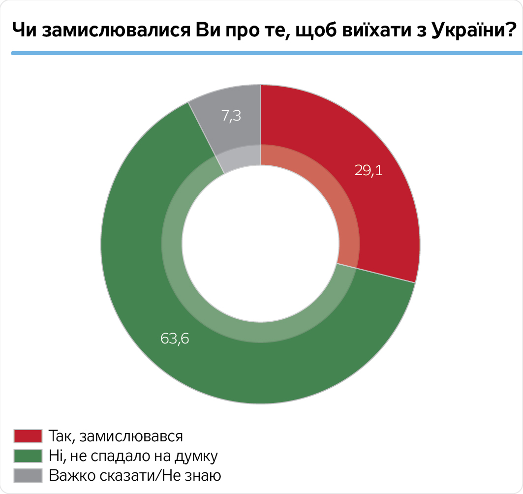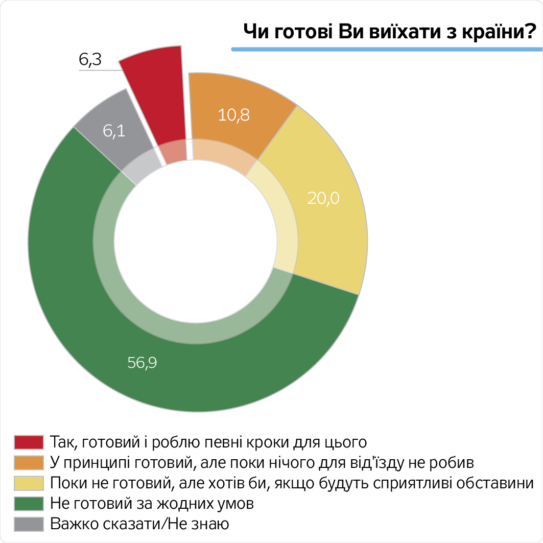 З іншого боку, 56,9% українців не готові виїжджати ні за яких обставин, а 63,6% це навіть не приходило в голову.