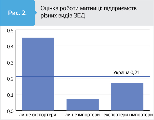 Оцінки роботи митниці залежать від виду зовнішньоекономічної діяльності, галузі, розміру підприємств і регіону їх розташування. Експортери оцінюють роботу митниці краще, ніж імпортери. Так, 35% підприємств-експортерів вважають, що робота митниці ефективна, й нічого змінювати не потрібно. Тоді як серед імпортерів таких лише 13%.