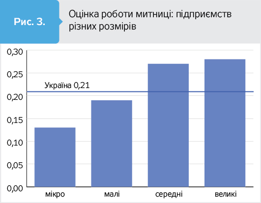 Про це у своїй статті для DT.UA пишуть Оксана Кузяків та Ірина Федець. За їхніми словами, із зменшенням розміру підприємства погіршуються оцінки роботи митниці. Мікропідприємства майже вдвічі гірше оцінюють роботу митниці порівняно з великими чи навіть середніми.