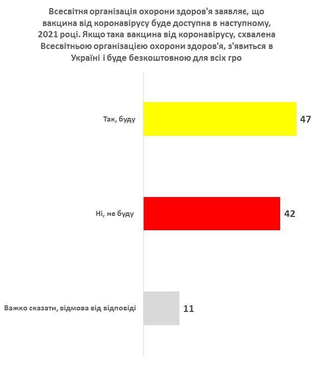 Менше 50% опитаних українців згодні вакцинуватися проти COVID-19 безкоштовною вакциною, яку схвалить Всесвітня організація здоров'я. При цьому 42% відмовляться від таких щеплень, і 11% ще не прийняли рішення. Про це повідомляє Київський міжнародний інститут соціології.