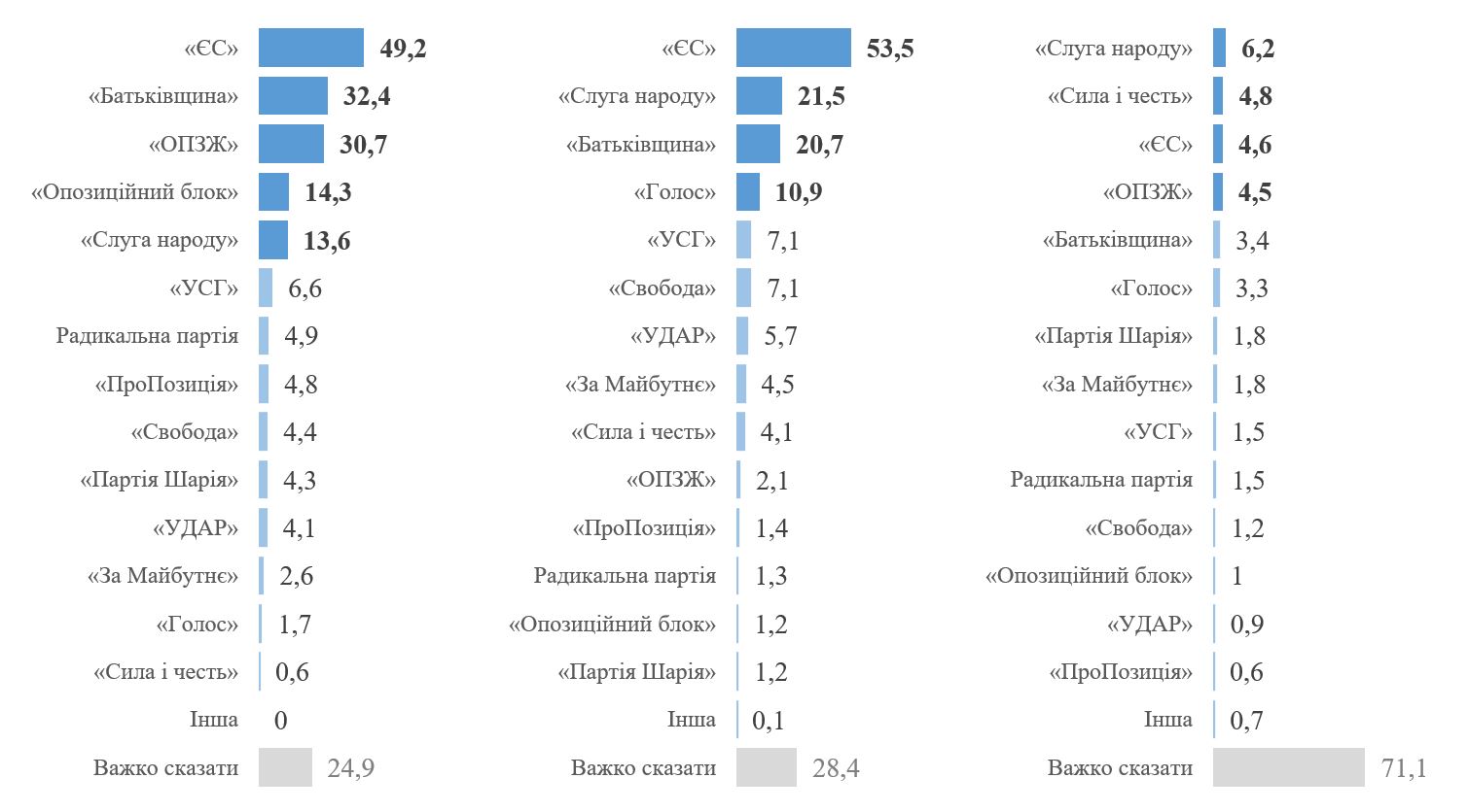Разом з тим, з корупцією найбільше респондентів асоціюють партії «ЄС» (49%), «Батьківщину» (32%) і «ОПЗЖ» (31%). По 14% назвали «Опозиційний блок» і «Слугу народу».