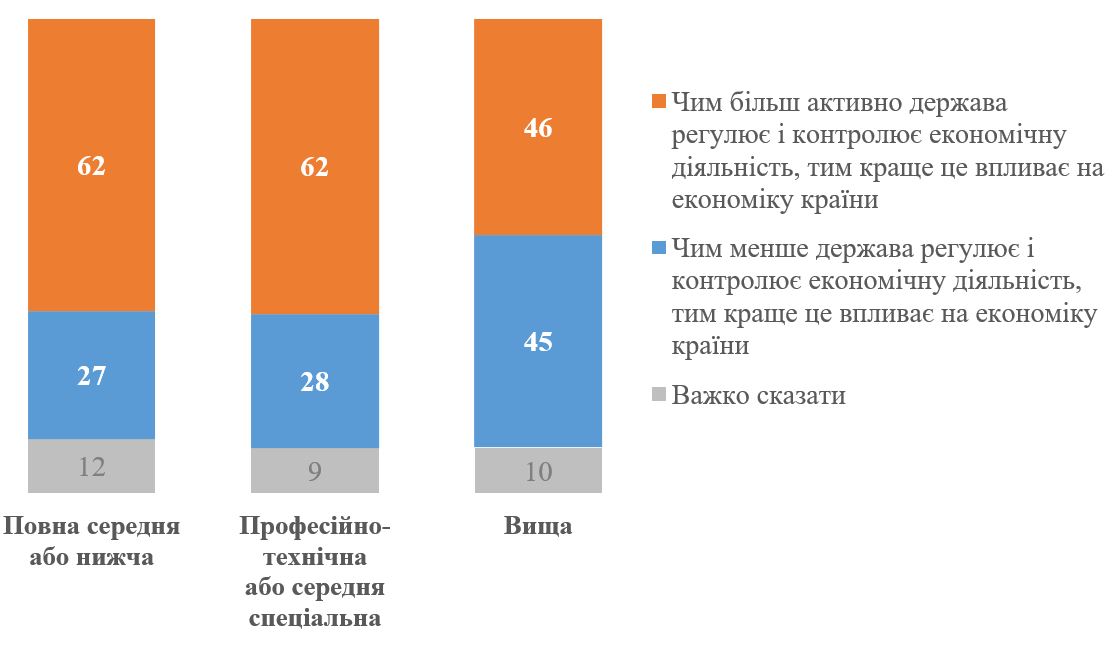 Якщо говорити про освіту респондентів, то вирізняються люди з вищою. Серед них 45% вважають, що держава має менше регулювати економічну діяльність. Проте і серед них 46% говорять про доцільність більш активної участі держави.