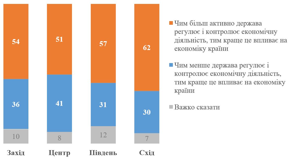 Якщо говорити про регіональний розріз, то у всіх регіонах переважає думка, що держава має більш активно регулювати та контролювати економічну діяльність. Дещо більш виражена така думка – на Півдні і Сході.