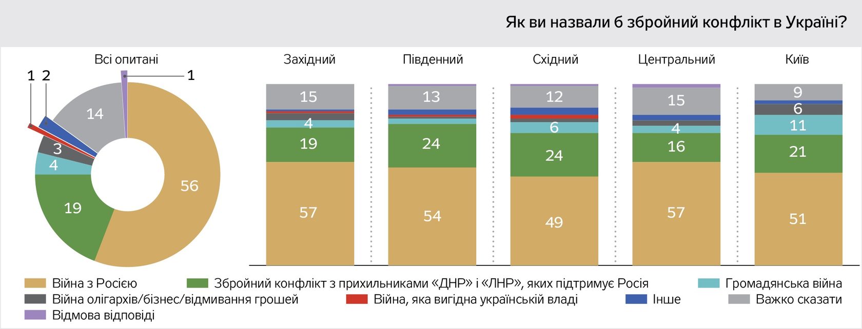 56% опитаних родичів загиблих вважають збройний конфлікт в Україні війною з Росією. Регіональні відмінності мінімальні: цей варіант відповіді обрали 57% учасників опитування на Заході і в Центрі, 54% - на Півдні, 51% - у столиці й 49% - на Сході. Ще 19% називають криваве протистояння в Донбасі збройним конфліктом із прибічниками т.зв. ДНР і ЛНР, яких підтримує Російська Федерація.